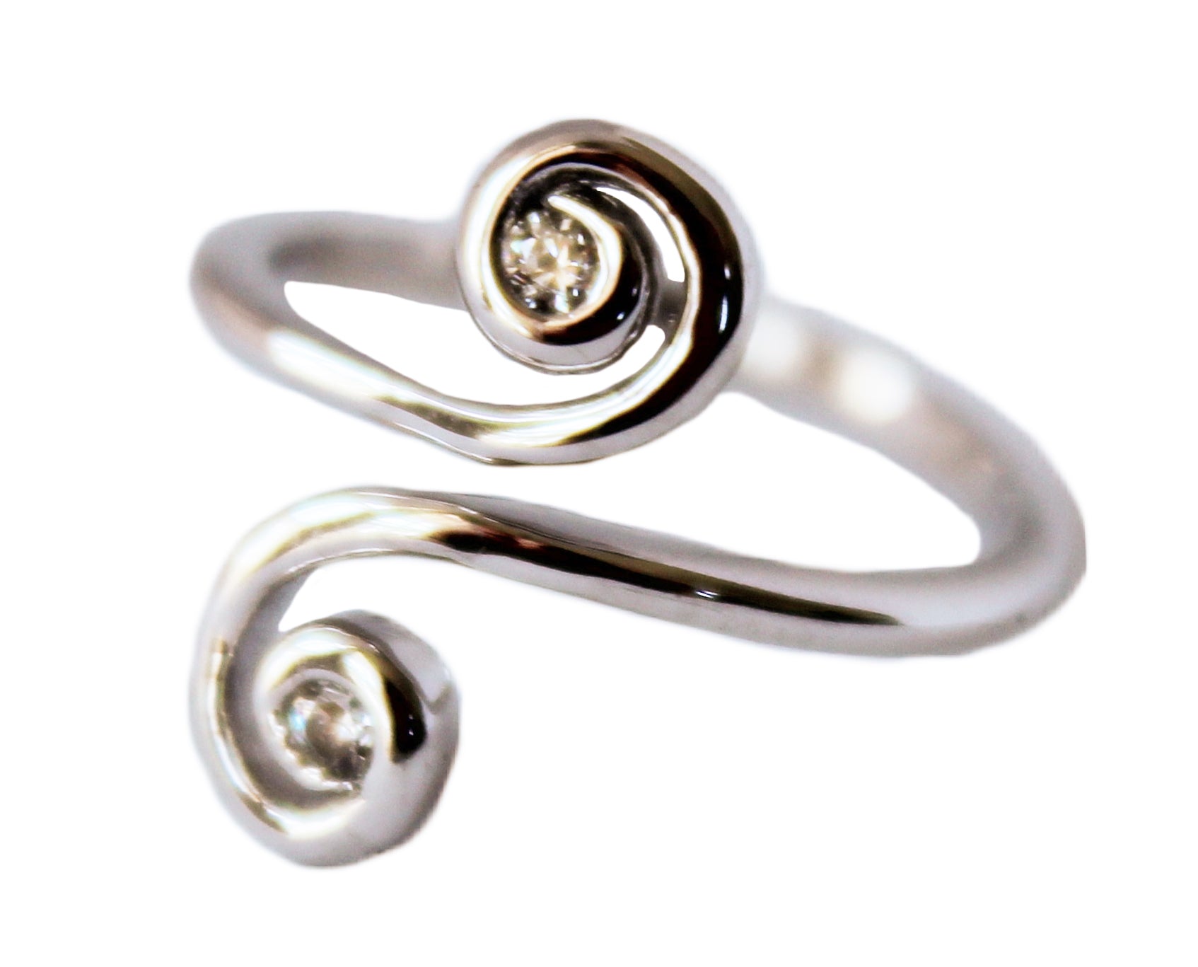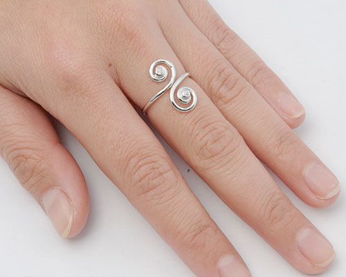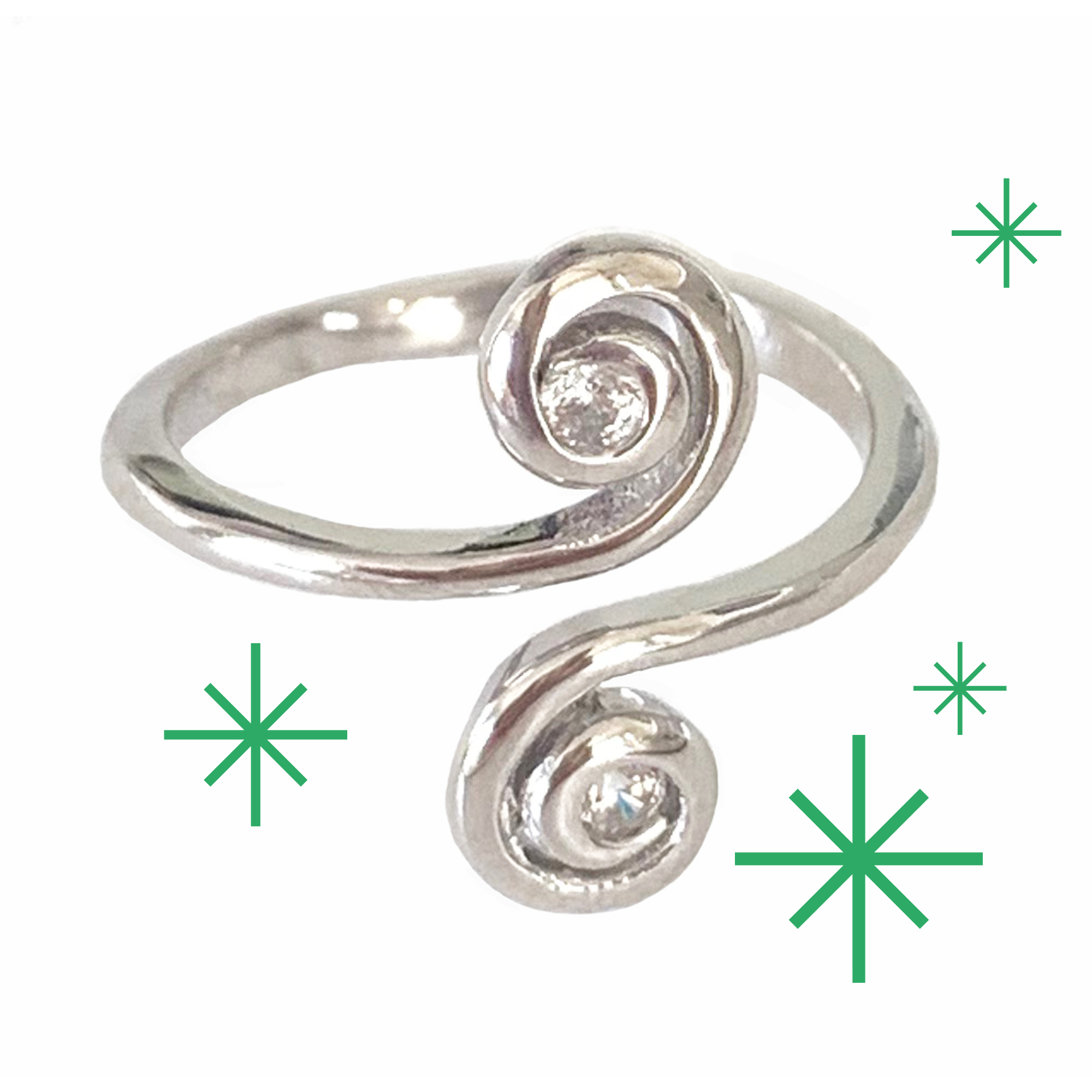 One of our most popular front adjusting toe rings. A sparkling sterling S-shape wrap punctuated with two shiny CZ stones. Also looks great as a knuckle or pinky ring. One size fits all.