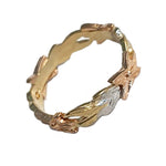 Indulge in the luxurious beauty of Maui Blossom 14K Toe Ring, featuring three stunning shades of gold in one exquisite band. Adorned with delicate pink plumeria flowers and vibrant yellow and white maile leaves, it serves as a perfect reminder of your tropical getaway. This versatile piece can also be worn as a charming pinky ring. Elevate your style and give in to the allure of this golden treasure.