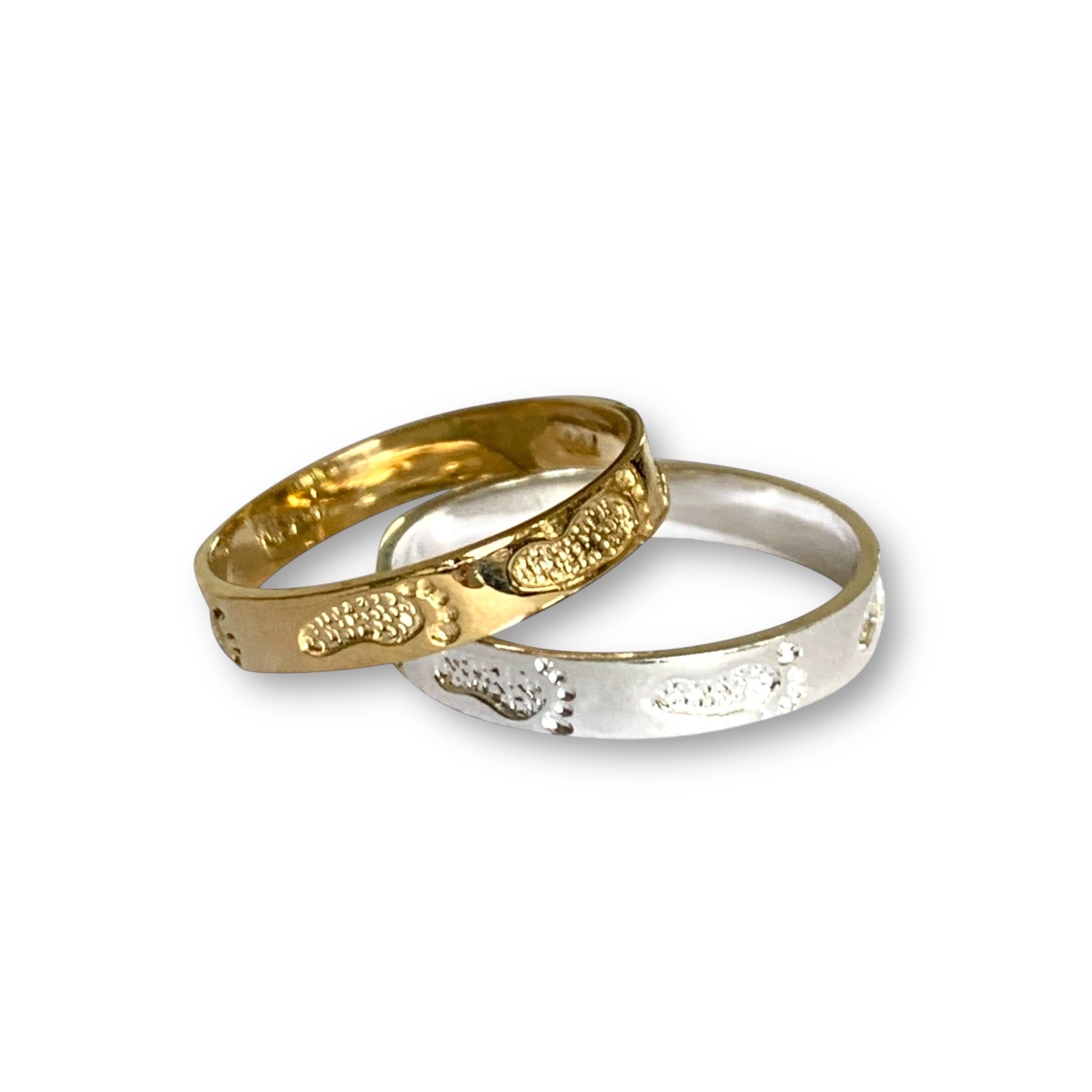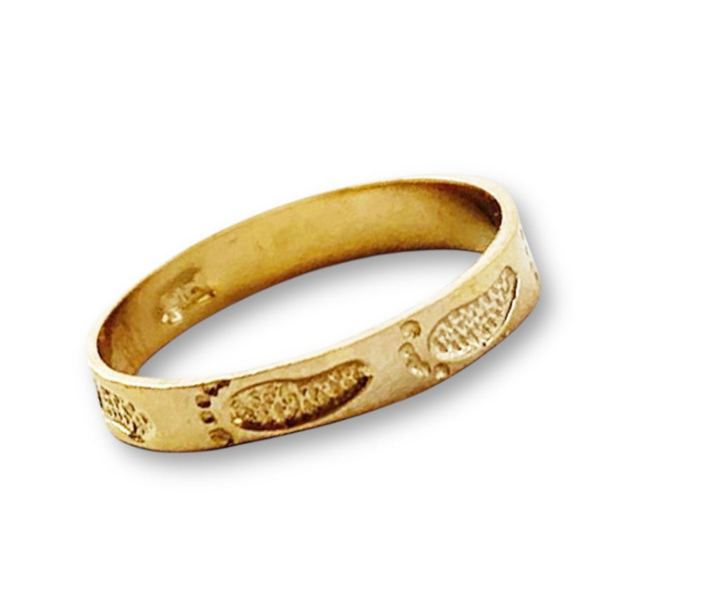 Hang tens all the way around, a 2mm 14k band imprinted with footprints.