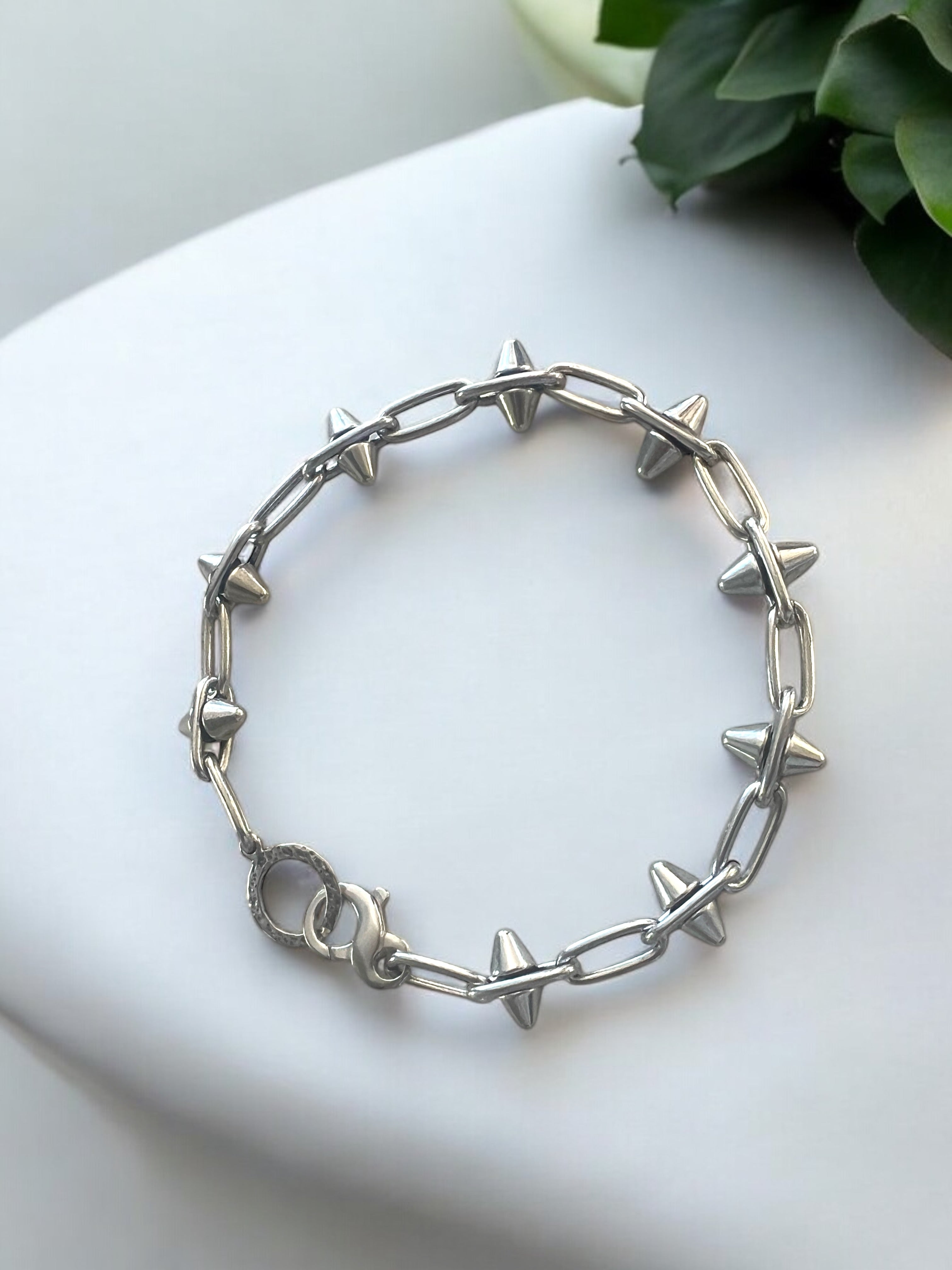 Make a bold statement with this spiked silver chain, designed to be worn as a men's anklet or bracelet. Crafted from heavy silver, its edgy spikes add a daring touch to any outfit, perfect for those who want to stand out with confidence and style. Durable and striking, this accessory combines toughness with modern flair.
