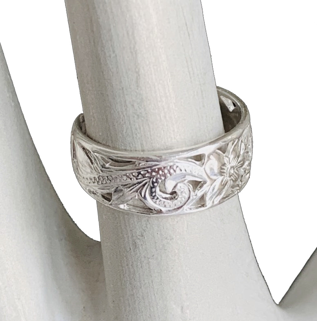 This heavenly flower adjustable band is 6mm wide (a bit over 1/4") and captures everything to love about the island state of Hawaii. Plumeria flowers, waves and wind are featured in our wide custom design. Unisex, would look great on men or women, or get a matching pair! Made in the USA. One size fits all.