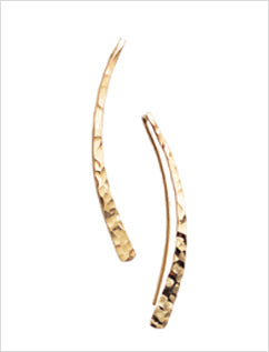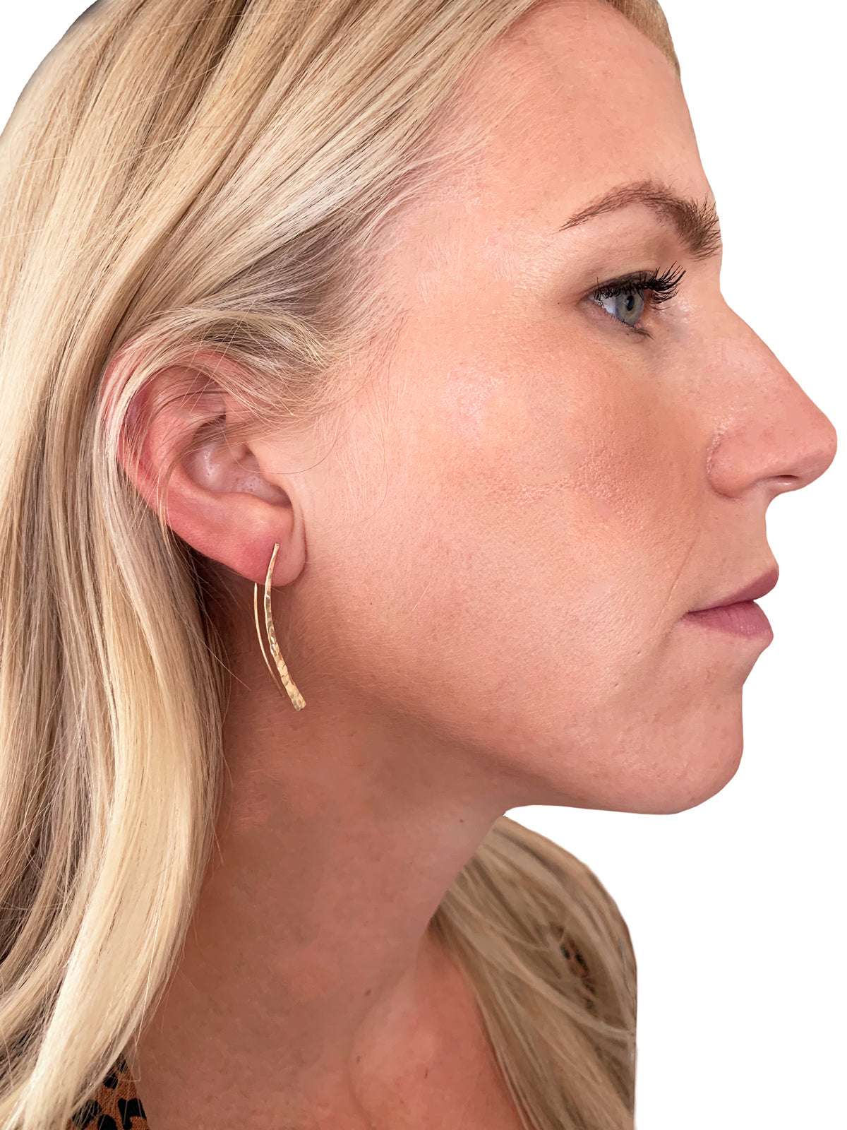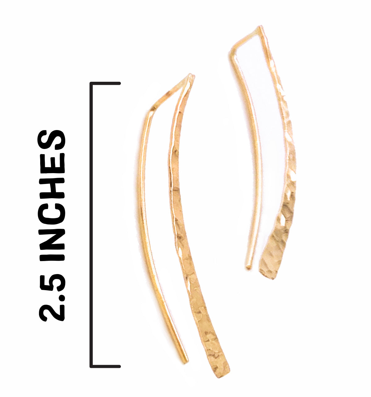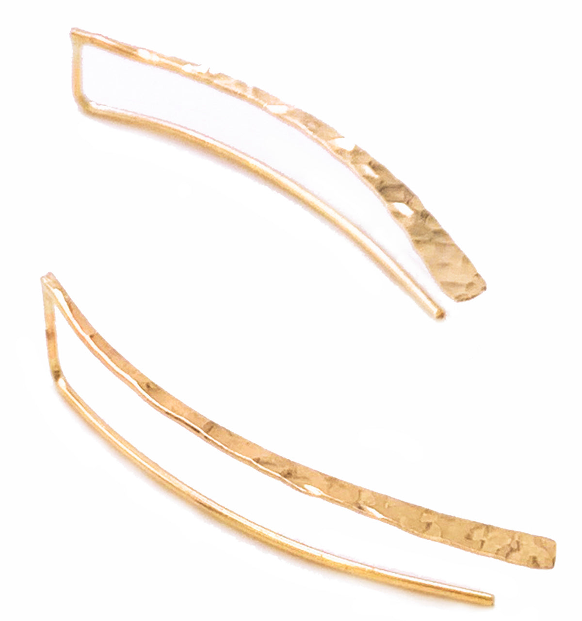 HANDMADE! Beautiful, clean and classic minimalist earrings, sure to be your go-to for day or evening wear. 14K gold fill or sterling silver, hammered gently and lightly to give a custom look. Earring has slight curve with a long back drop; solid thread so no earring back is needed. Two sizes, 3cm (approximately 1 1/2") or 5 cm (approximately 2 1/2").