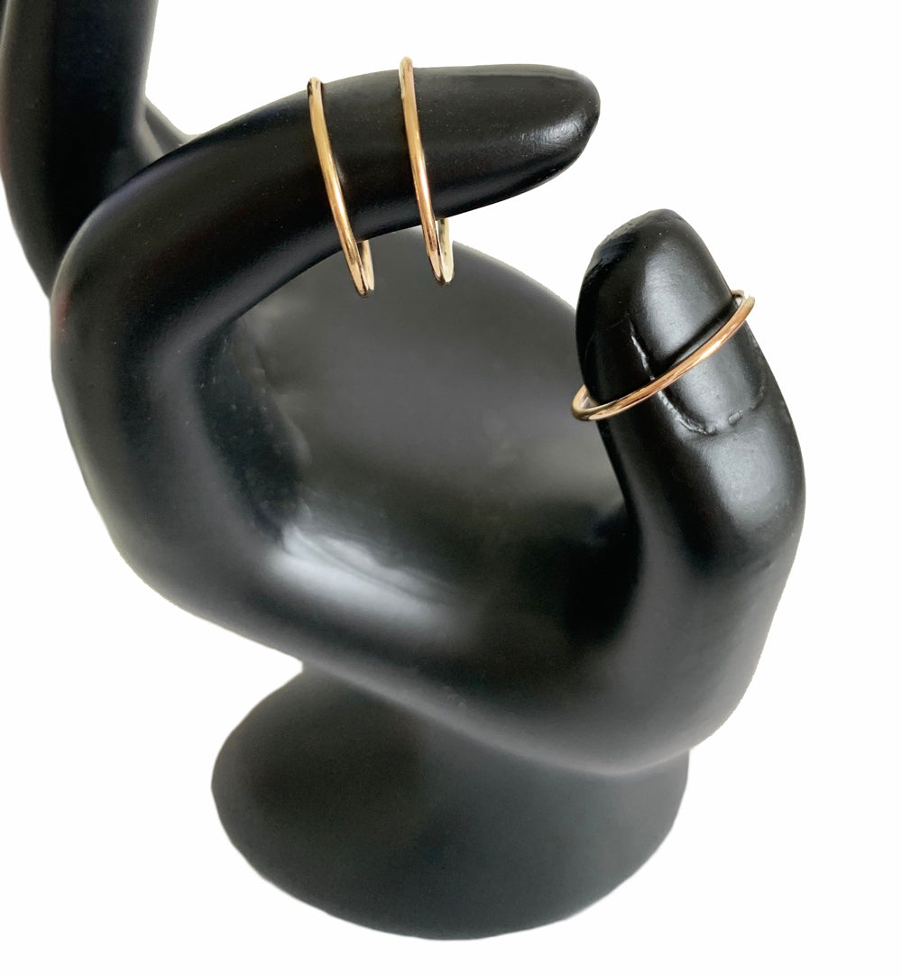 Hot item! We took three super skinny 1mm round bands to make this great combo. Separate, they're great on different toes; together they make a sleek skinny combo. When you order the stack you save 10%! Order small for best fit. Unisex style with sizes to fit men and women. Prices vary according to material.