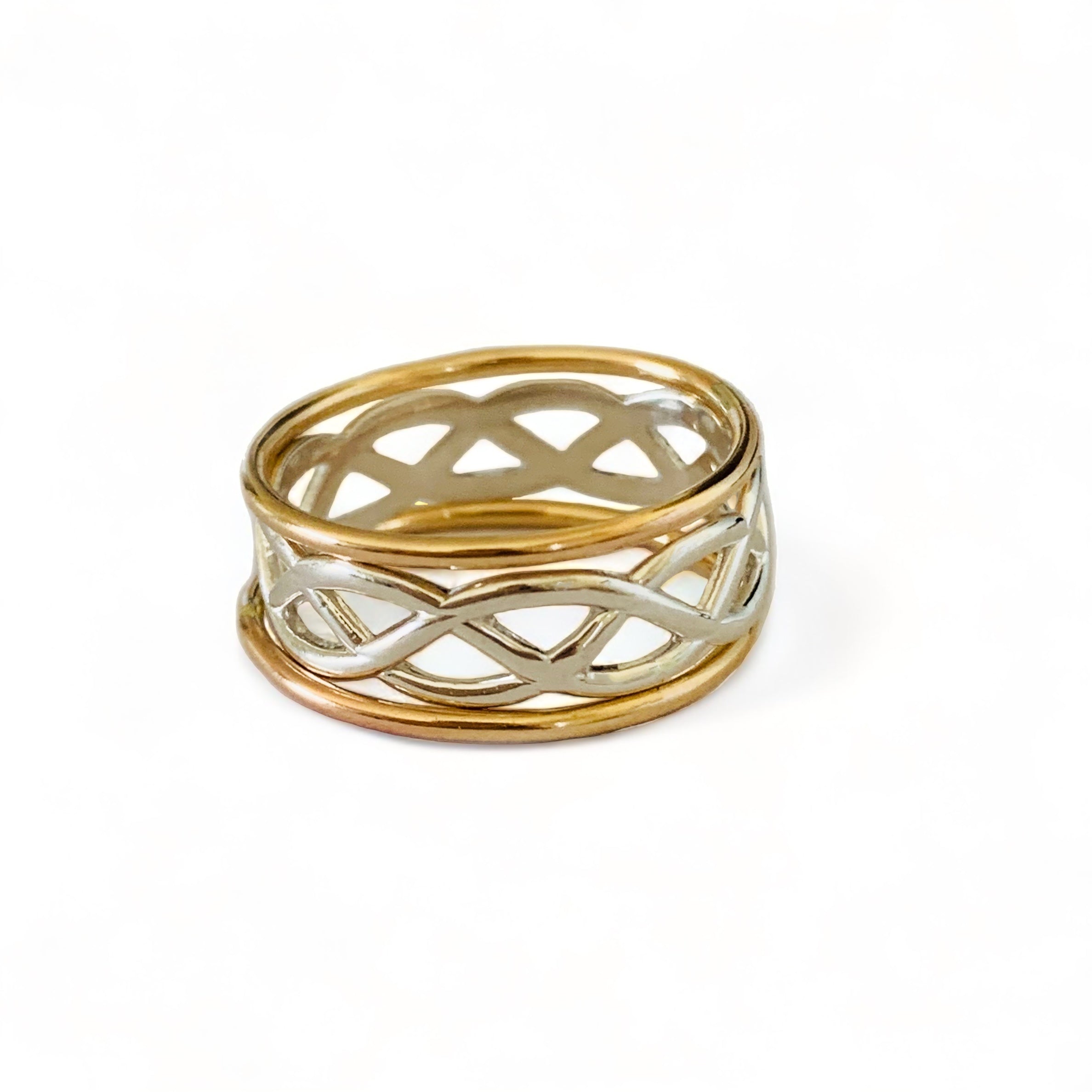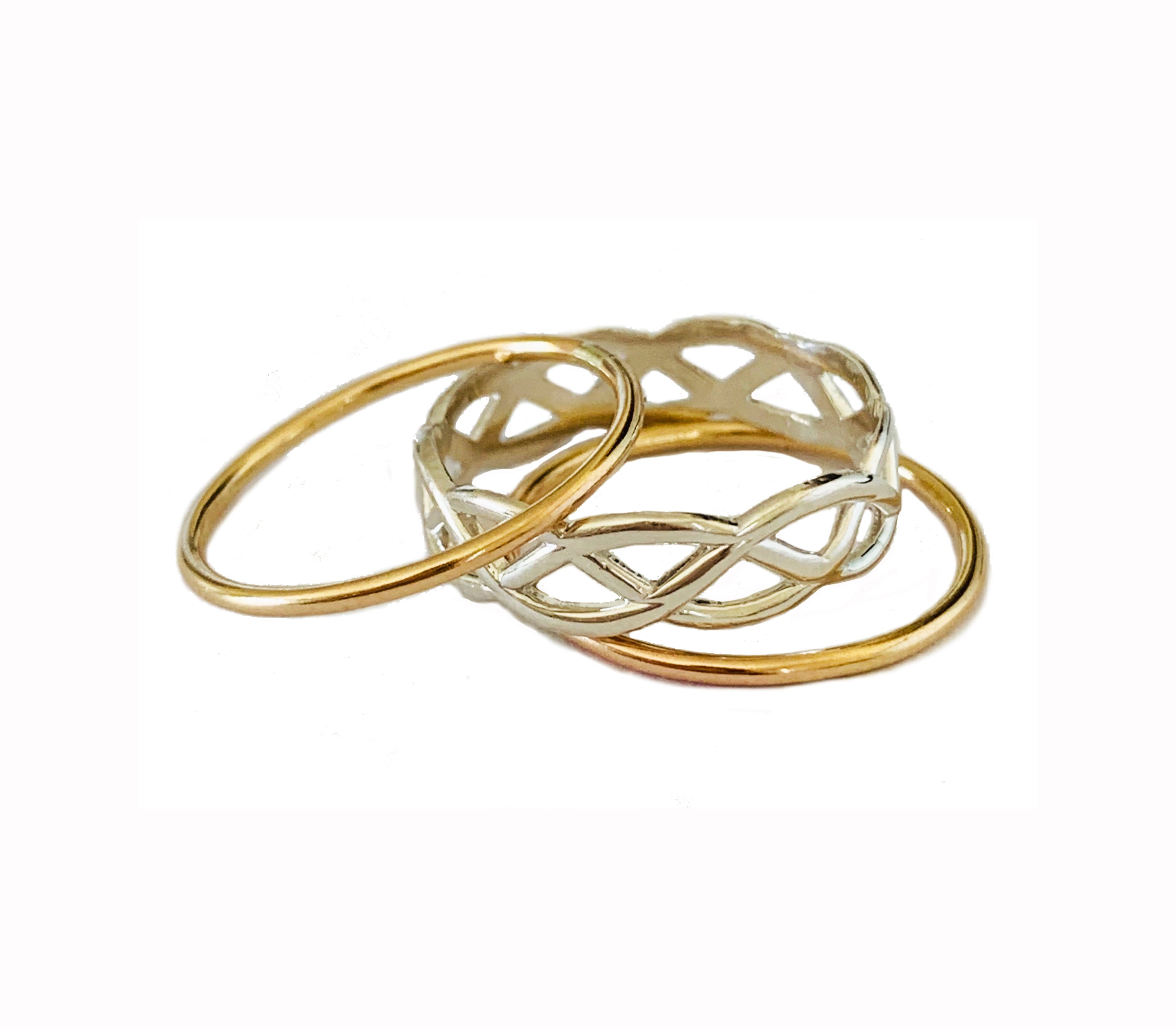 One of our most popular ring styles in a stack - Celtic Weave is our best seller and it looks amazing stacked with 1mm bands on either side. Available in all sterling or sterling with 14k gold fill 1mm flanks - a great value! Save 10% over regular price when you buy a stack! Also available in 14k gold.