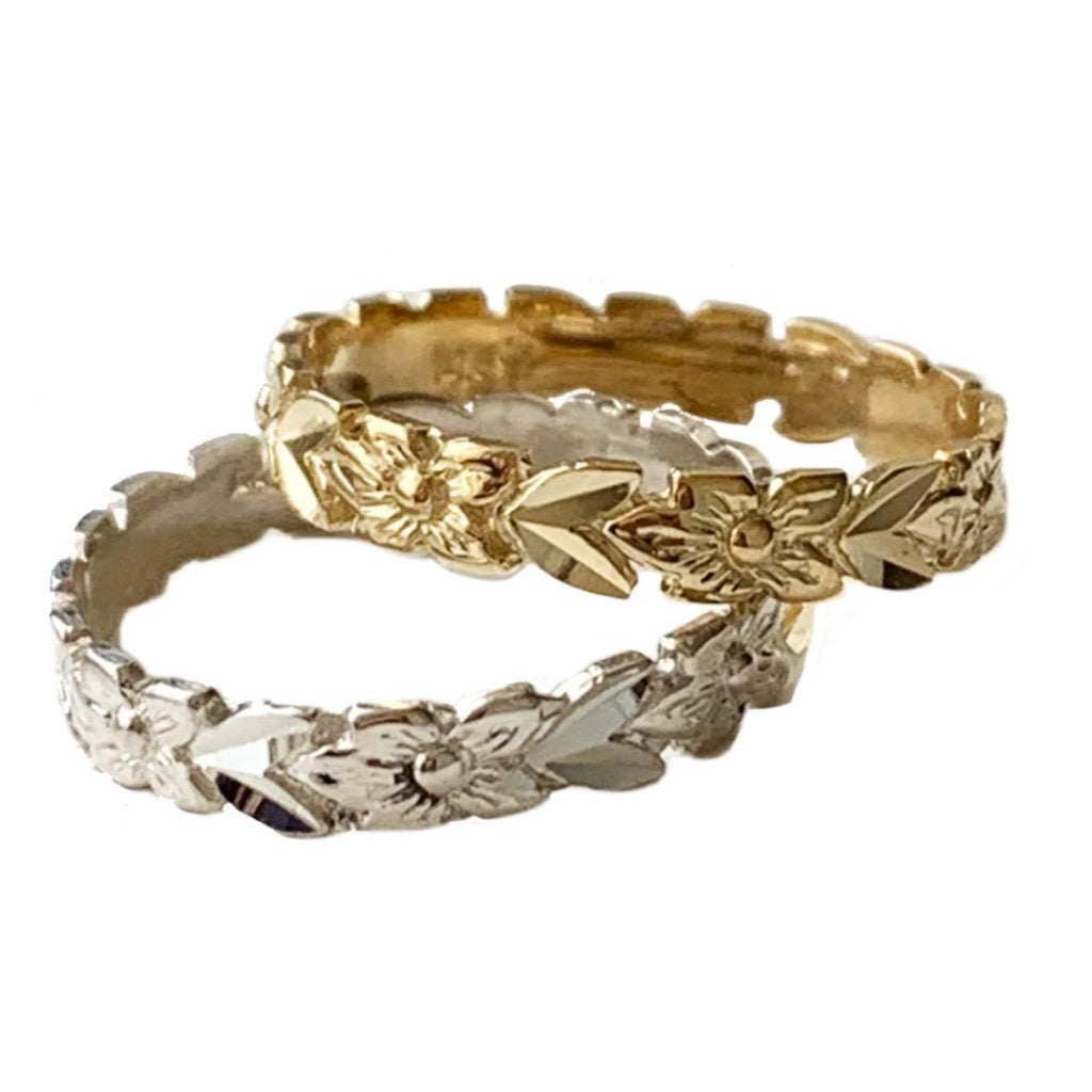 Paradise is a 14K diamond cut design of plumeria flowers framed with island maile leaves. It offers the ultimate in comfort and looks great stacked with other rings!