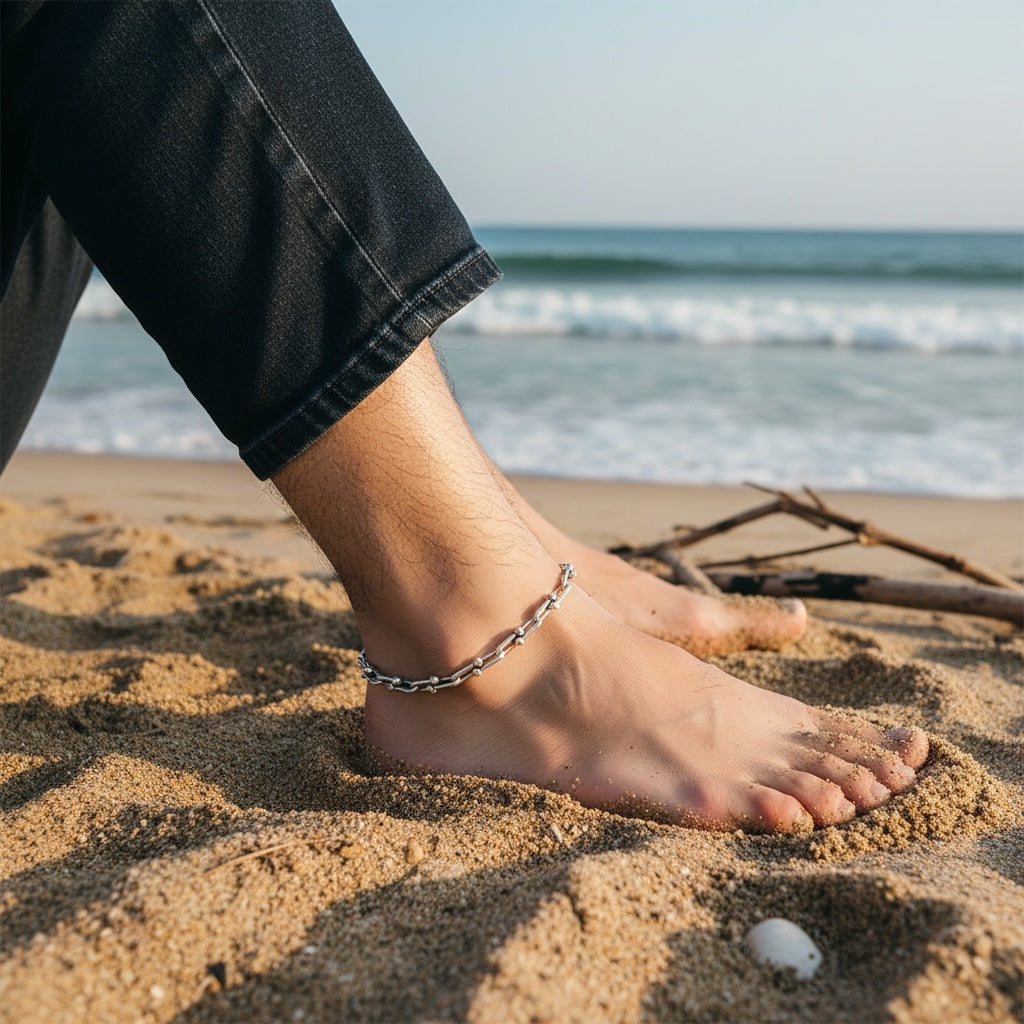 Handcrafted U chain anklet in German silver, designed for men who appreciate bold, distinctive jewelry. The substantial weight and oversized lobster clasp deliver a confident presence on the ankle. Each piece is individually made—exclusive to ToeRings.com and unavailable elsewhere! 11" length, can be adjusted down as needed.