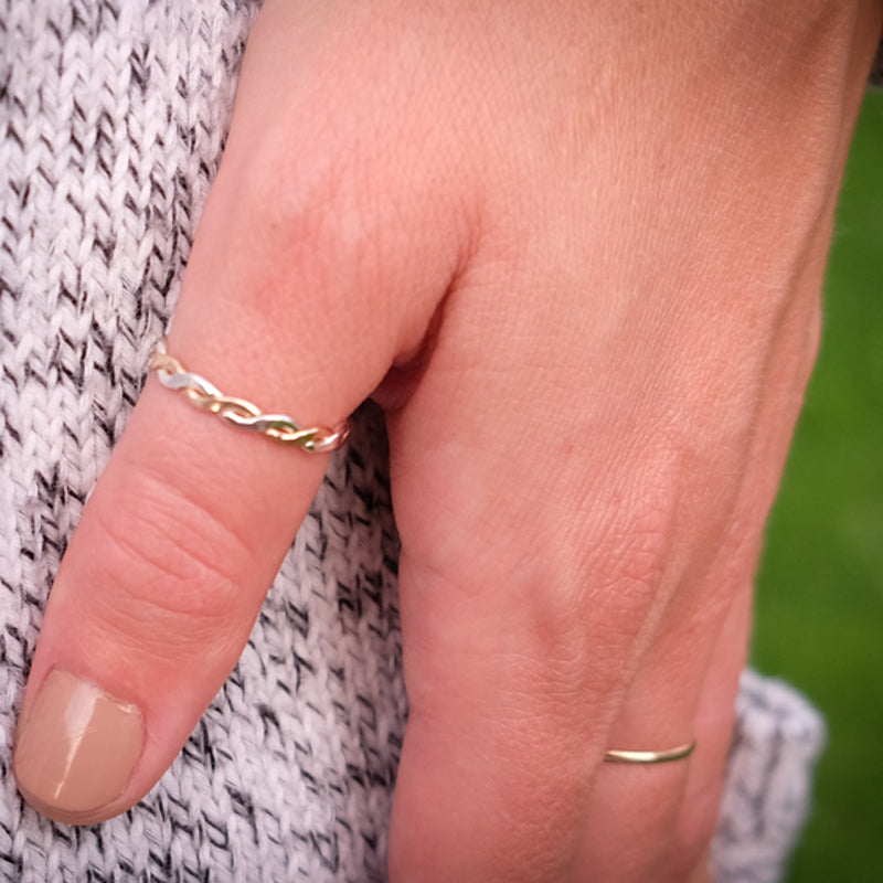 Best Seller! Strands of sterling silver and gold fill, intertwined to bring you a gorgeous two-toned braided thumb ring at an amazing price. Also available in smaller toe ring finger rings sizes.