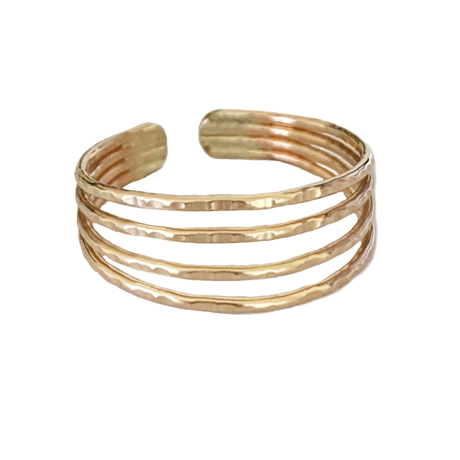 This is a great combo of four thin wires, hand crafted then hammered lightly for shimmer. 14k gold fill wire for a great durable look at a fraction of the price of gold. One size fits all.