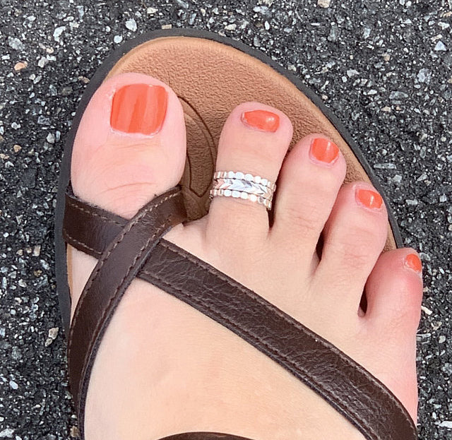 A shiny diamond cut Hula Lei flanked by two bee bands. A nice wider look for the expert toe ring wearer. When you buy the stack of three rings, you get 10% off. 2 - Bee Bee Sterling 1 - Hula Lei